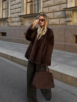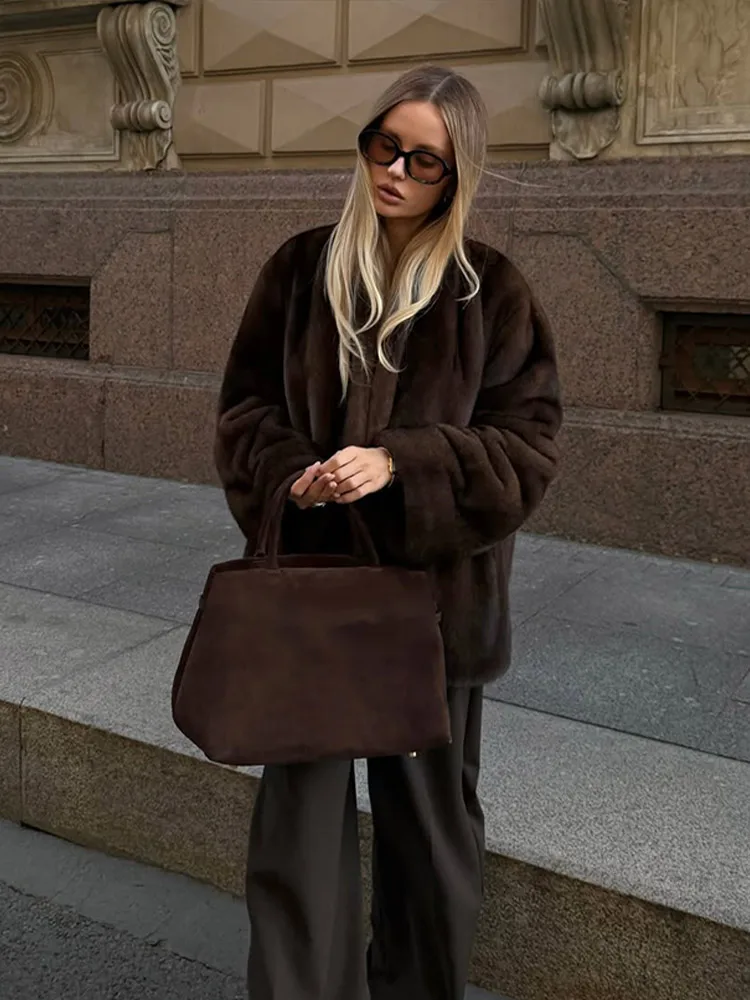 Embrace timeless style with this solid brown faux fur coat. Featuring a sophisticated lapel collar and a flattering V-neckline, it effortlessly elevates any outfit, making it perfect for both the winter commute and the office environment. -